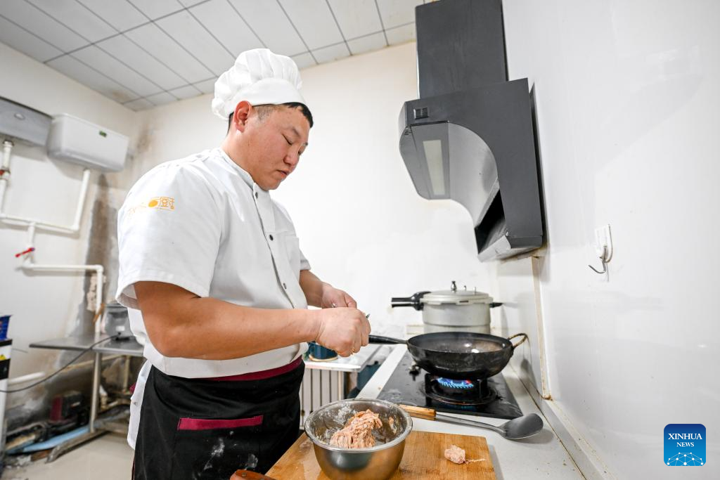 A policeman cooks a meal at the kitchen in Xilin Gol League, north China's Inner Mongolia Autonomous Region, Jan. 8, 2025. (Xinhua/Lian Zhen)