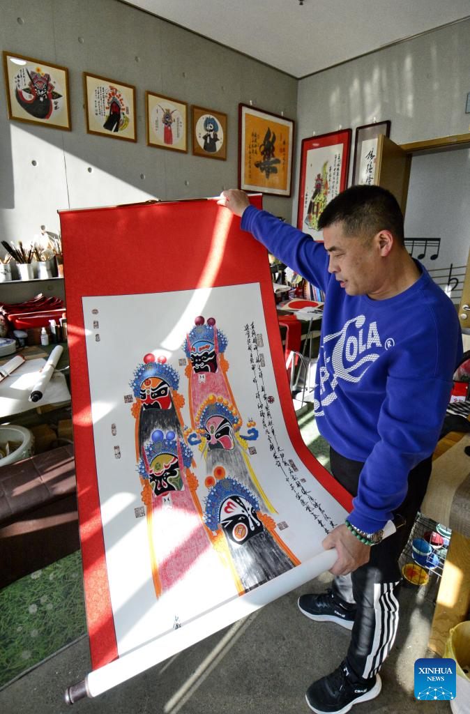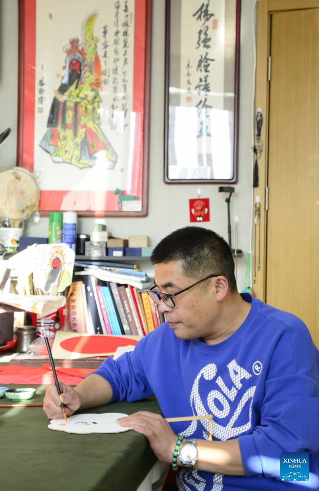 Yang Qiang displays his Peking Opera facial makeup painting at a cultural center in Shijingshan District in Beijing, capital of China, Jan. 8, 2025. (Xinhua/Li Xin)