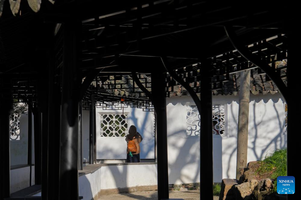 A tourist visits the Humble Administrator's Garden in Suzhou, east China's Jiangsu Province, Jan. 9, 2025. The Humble Administrator's Garden was inscribed in the list of World Cultural Heritage by the UNESCO in 1997. (Xinhua/Li Bo)