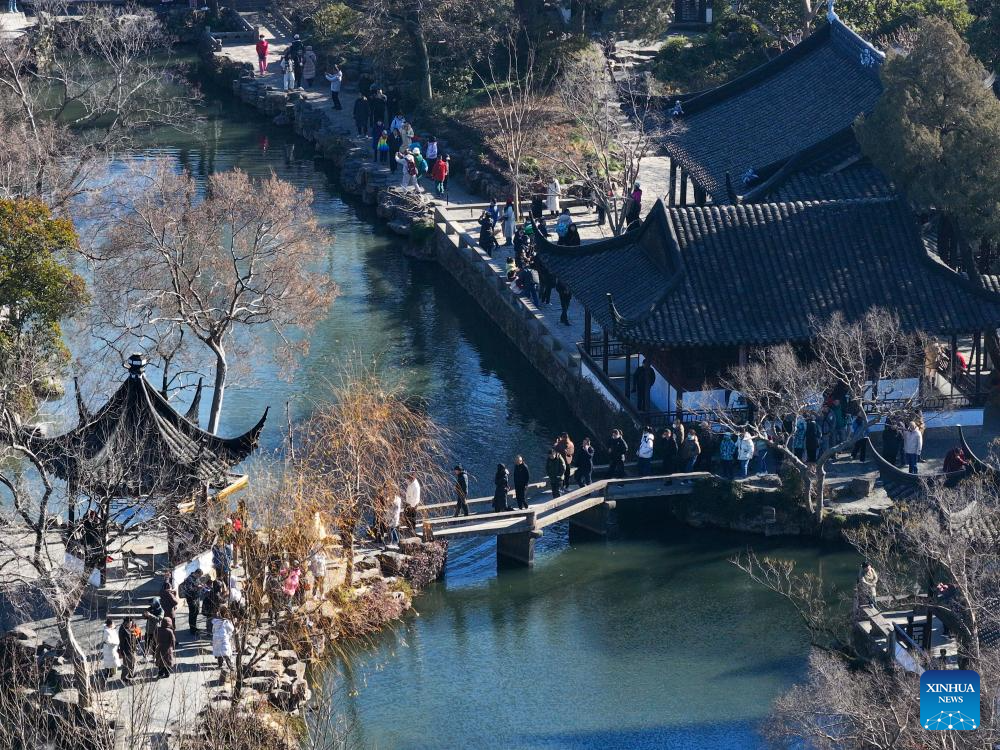 An aerial drone photo taken on Jan. 9, 2025 shows tourists visiting the Humble Administrator's Garden in Suzhou, east China's Jiangsu Province. The Humble Administrator's Garden was inscribed in the list of World Cultural Heritage by the UNESCO in 1997. (Xinhua/Li Bo)
