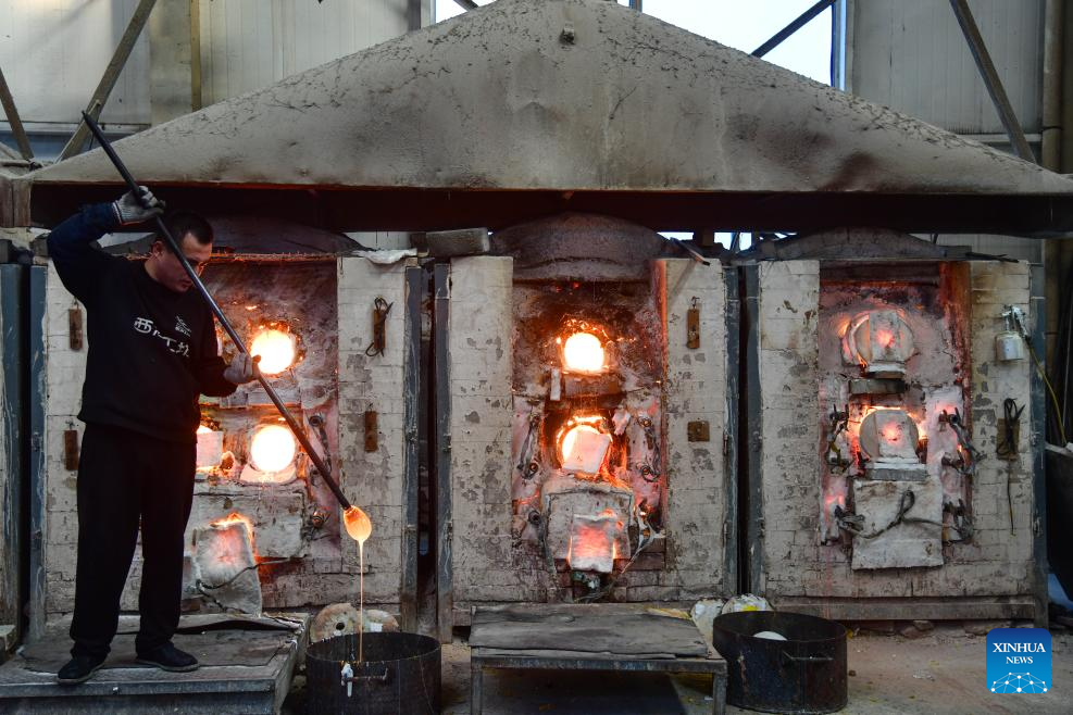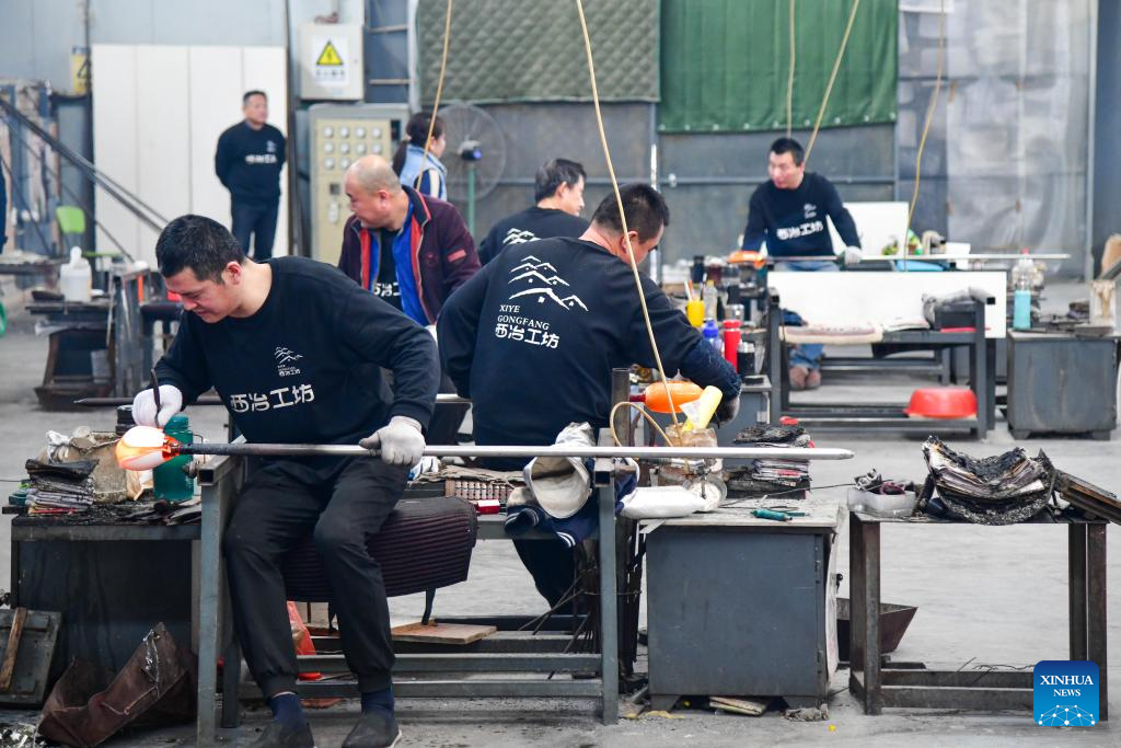 Workers make colored glaze crafts in Boshan district of Zibo City, east China's Shandong Province, Jan. 9, 2025. Boshan district of Zibo city is well-known for the industry of colored glaze making. As the Spring Festival, or Chinese Lunar New Year, approaches, decorative colored glaze crafts made in Boshan won popularity among customers. (Xinhua/Zhu Zheng)
