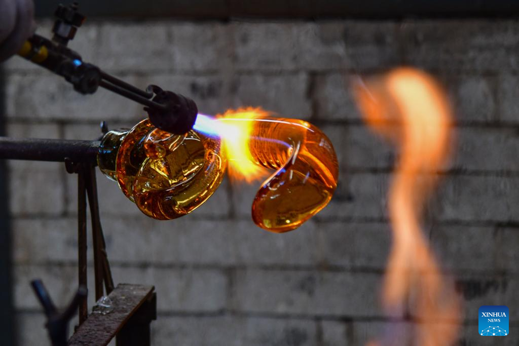 A worker makes colored glaze crafts in Boshan district of Zibo City, east China's Shandong Province, Jan. 9, 2025. Boshan district of Zibo city is well-known for the industry of colored glaze making. As the Spring Festival, or Chinese Lunar New Year, approaches, decorative colored glaze crafts made in Boshan won popularity among customers. (Xinhua/Zhu Zheng)