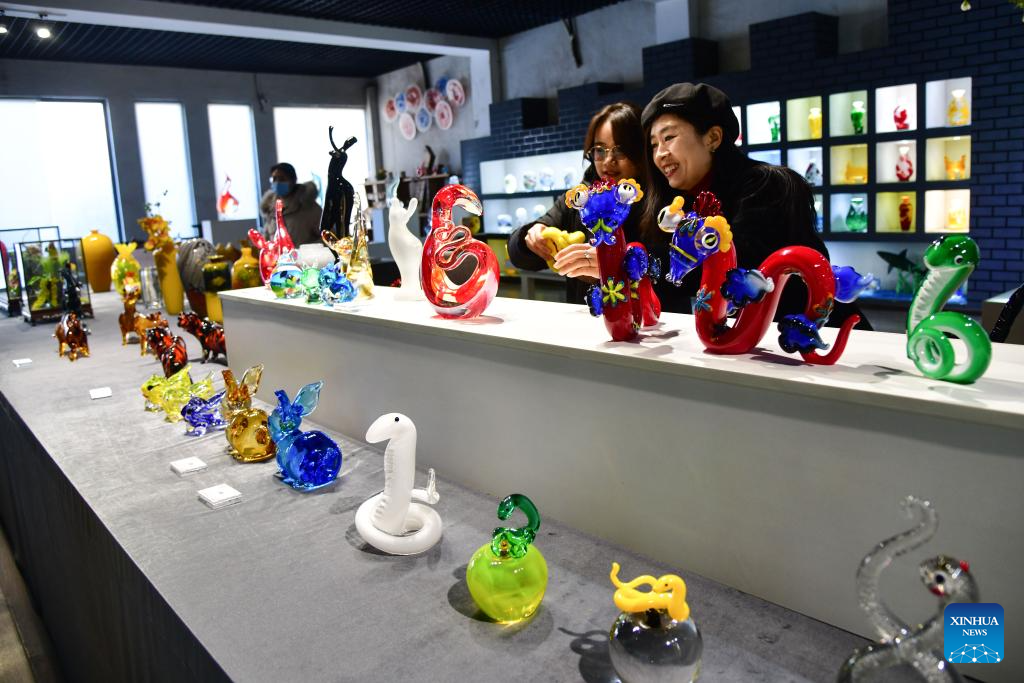 Customers select colored glaze crafts themed on the Year of the Snake in Boshan district of Zibo City, east China's Shandong Province, Jan. 9, 2025. Boshan district of Zibo city is well-known for the industry of colored glaze making. As the Spring Festival, or Chinese Lunar New Year, approaches, decorative colored glaze crafts made in Boshan won popularity among customers. (Xinhua/Zhu Zheng)