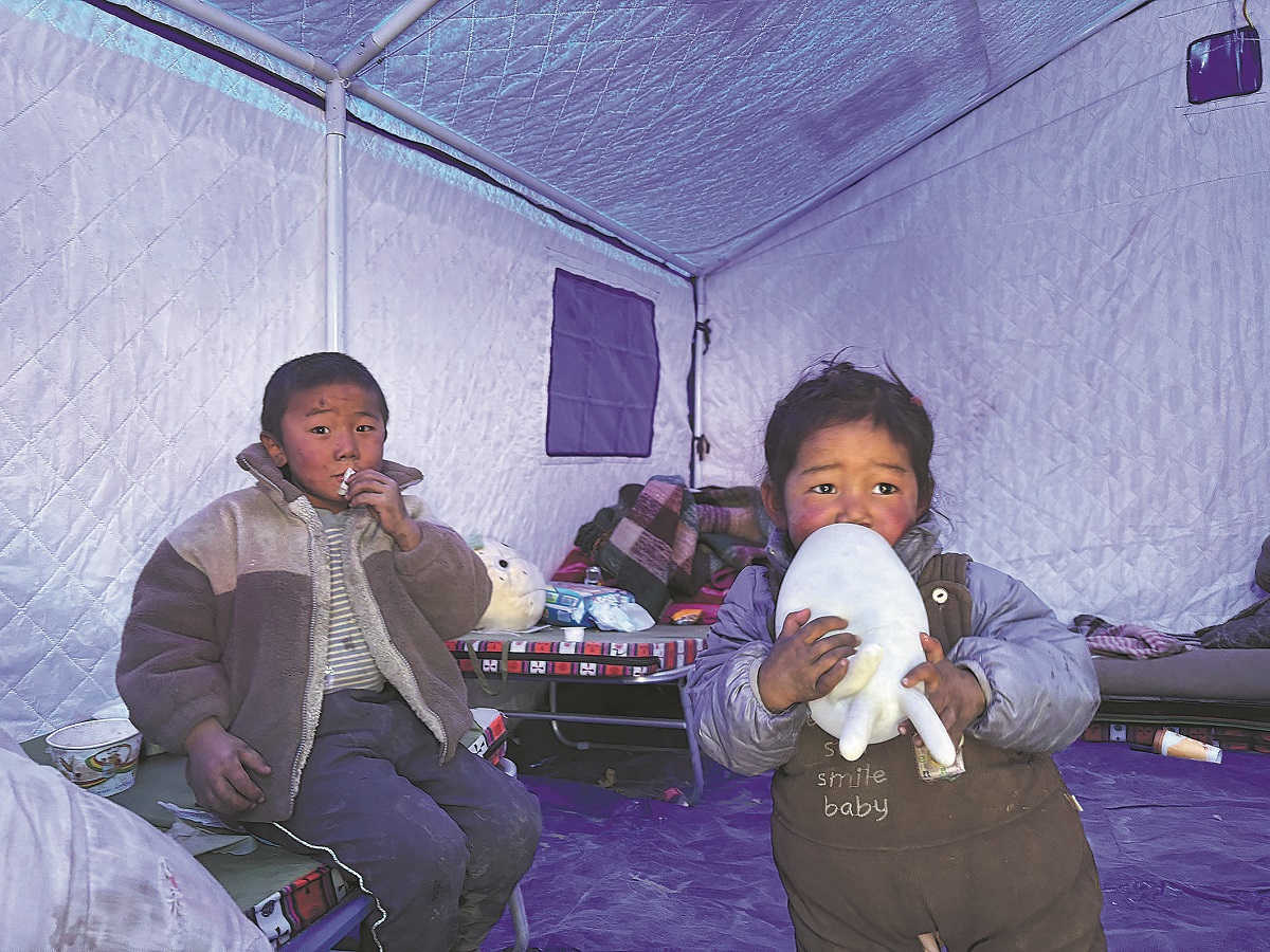 Children play in a resettlement tent on Thursday in Trakchung village. (Palden Nyima/China Daily)