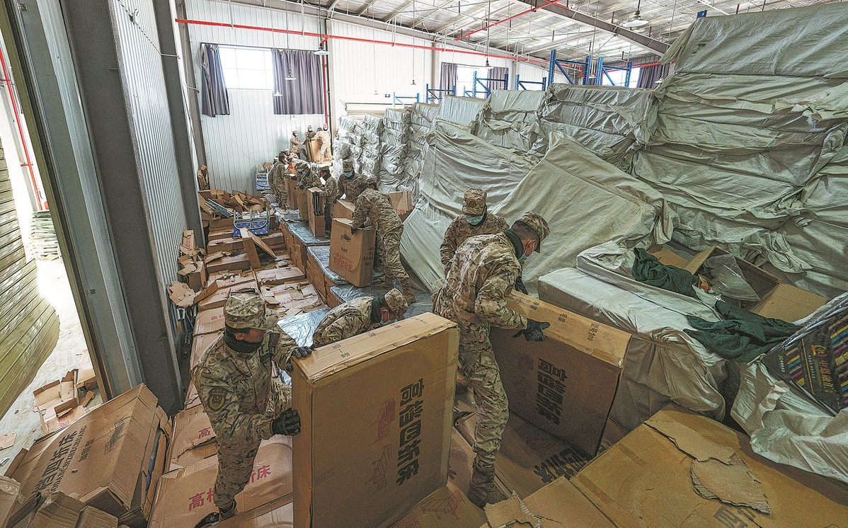 Armed police officers sort relief supplies at a warehouse in quake-hit Shigatse, Xizang autonomous region, on Wednesday. (Tenzin Nyida/Xinhua)