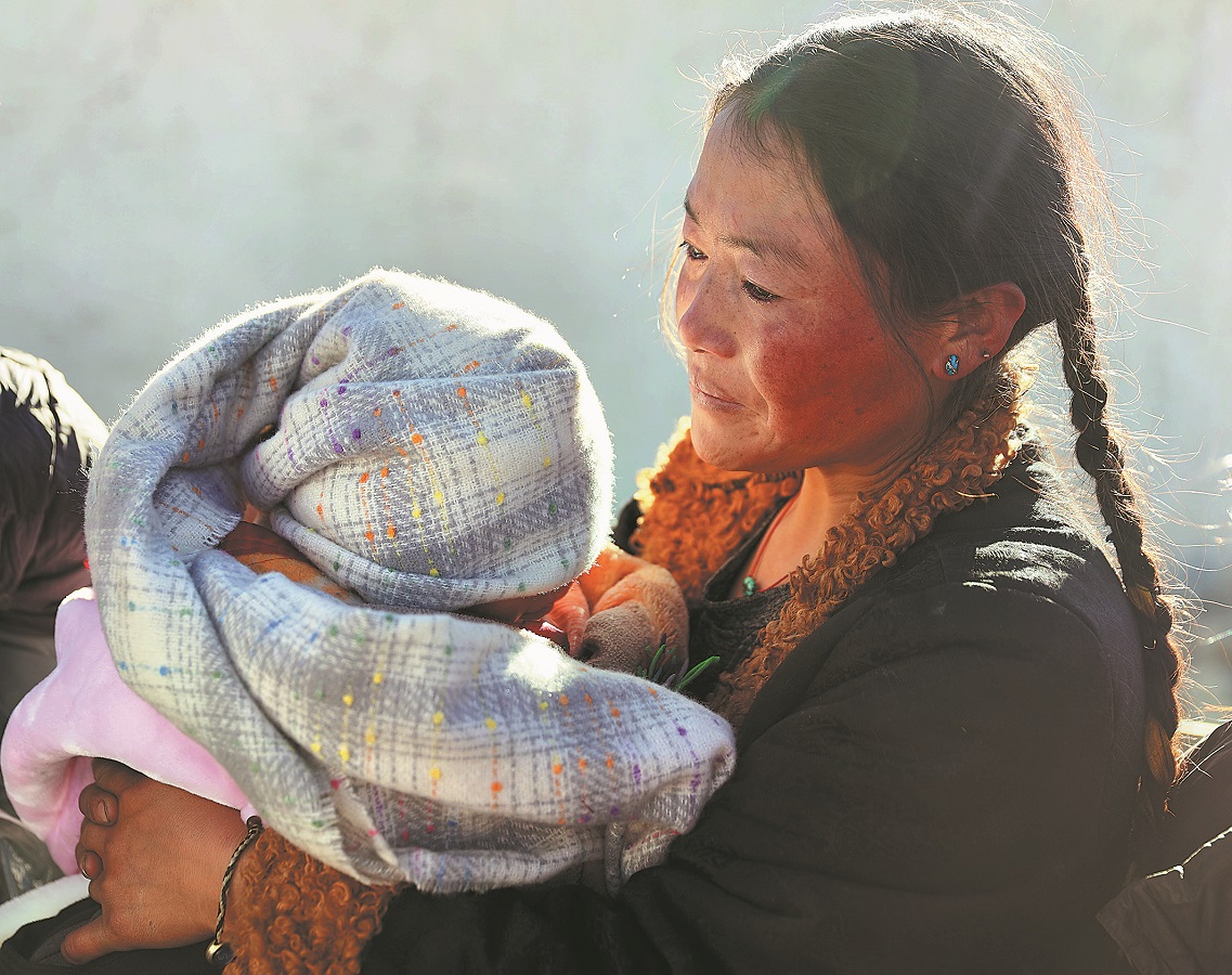 A woman, carrying her child, receives warm clothes from volunteers on Wednesday at Thongley, a village in Dramso township of Dingri county in Shigatse. (Jiang Fan/Xinhua)