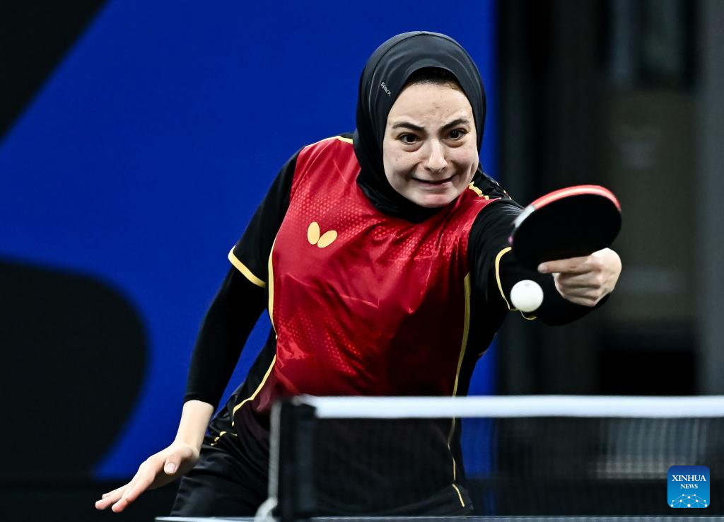 Dina Meshref of Egypt hits a return during the women's singles round of 32 match between Chen Yi of China and Dina Meshref of Egypt at WTT Star Contender Doha 2025 in Doha, Qatar, Jan. 9, 2025. (Photo by Nikku/Xinhua)