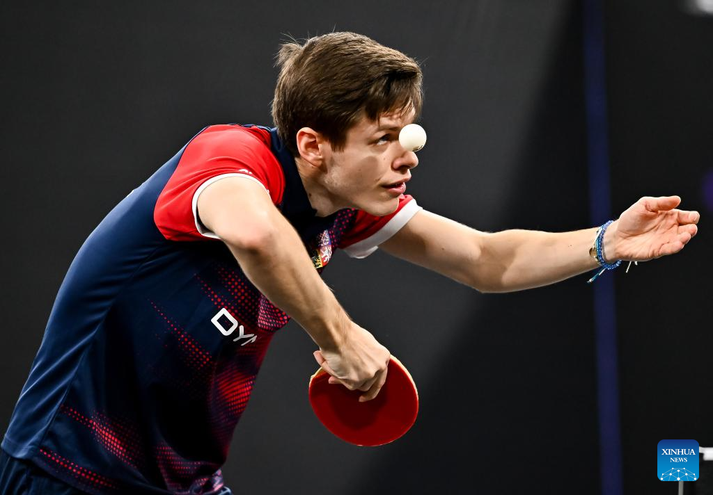 Tomas Polansky of the Czech Republic hits a return during the men's singles round of 32 match between Xiang Peng of China and Tomas Polansky of the Czech Republic at WTT Star Contender Doha 2025 in Doha, Qatar, Jan. 9, 2025. (Photo by Nikku/Xinhua)