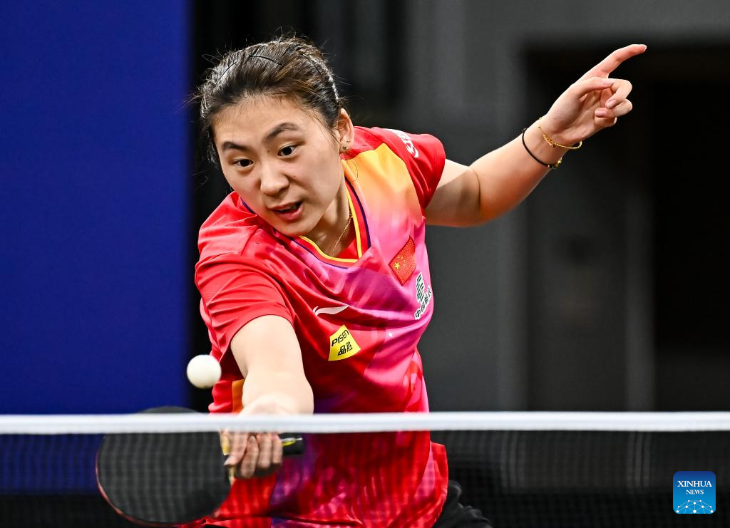 Chen Yi of China hits a return during the women's singles round of 32 match between Chen Yi of China and Dina Meshref of Egypt at WTT Star Contender Doha 2025 in Doha, Qatar, Jan. 9, 2025. (Photo by Nikku/Xinhua)