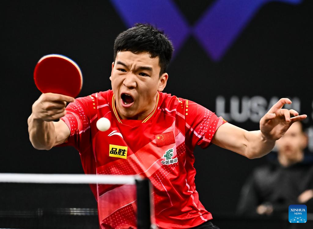 Xiang Peng of China hits a return during the men's singles round of 32 match between Xiang Peng of China and Tomas Polansky of the Czech Republic at WTT Star Contender Doha 2025 in Doha, Qatar, Jan. 9, 2025. (Photo by Nikku/Xinhua)
