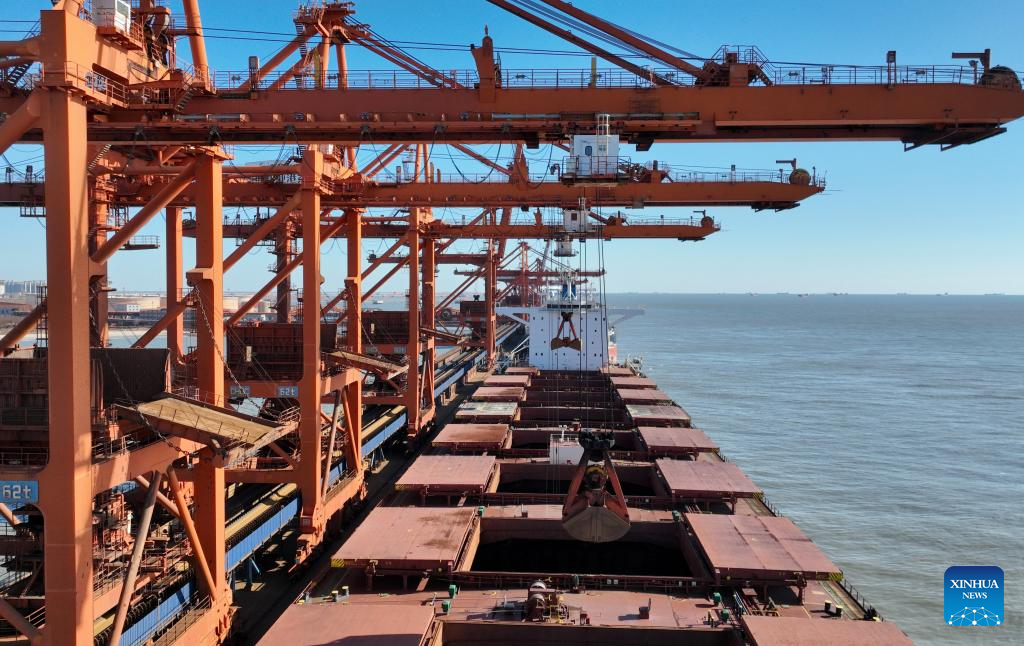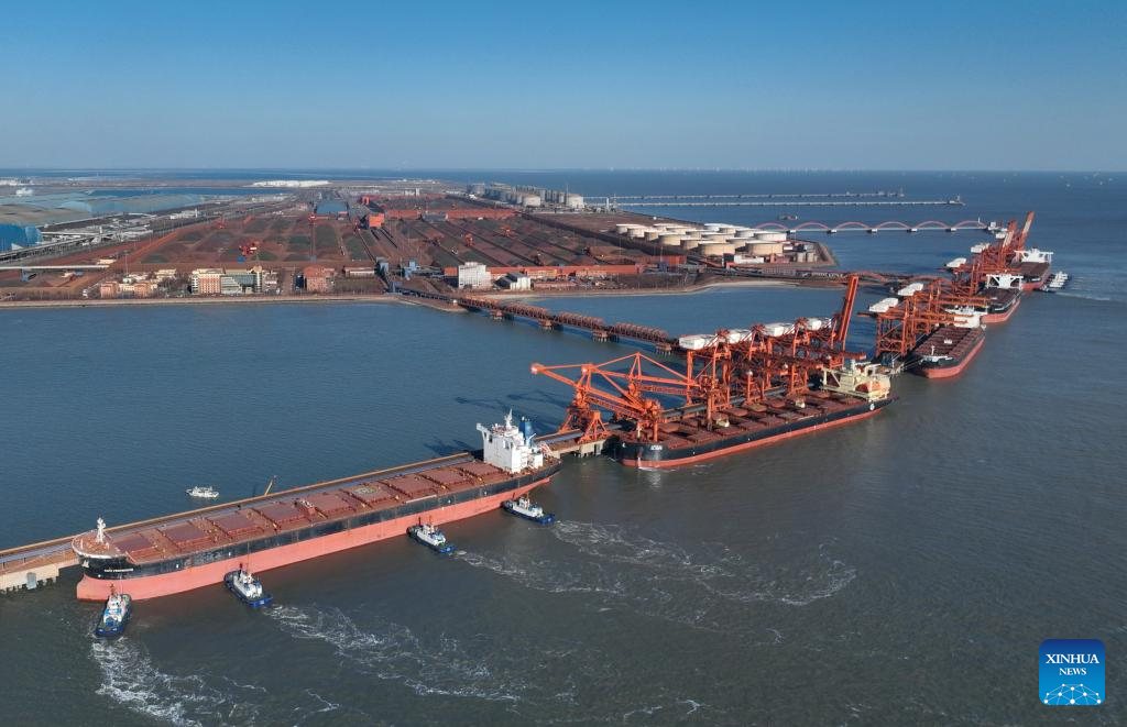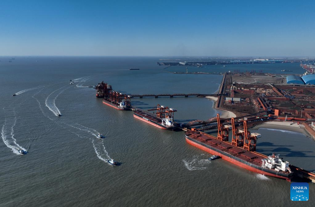 An aerial drone photo taken on Jan. 9, 2025 shows ships unloading cargo at the ore dock of Caofeidian port area of the Tangshan Port in north China's Hebei Province. The province's total port cargo throughput reached a record high of 1.405 billion tonnes in 2024, up 3.2 percent year-on-year. (Xinhua/Yang Shiyao)