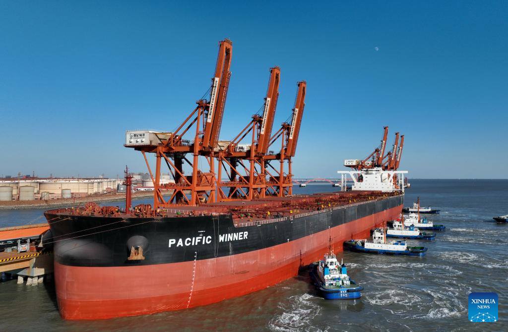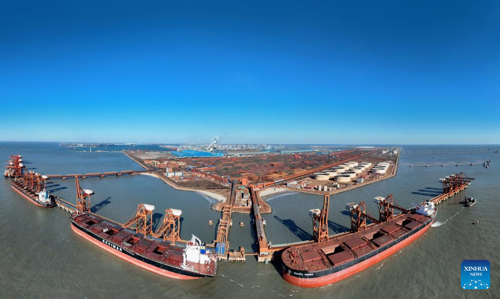 A panoramic aerial drone photo taken on Jan. 9, 2025 shows ships unloading cargo at the ore dock of Caofeidian port area of the Tangshan Port in north China's Hebei Province. The province's total port cargo throughput reached a record high of 1.405 billion tonnes in 2024, up 3.2 percent year-on-year. (Xinhua/Yang Shiyao)