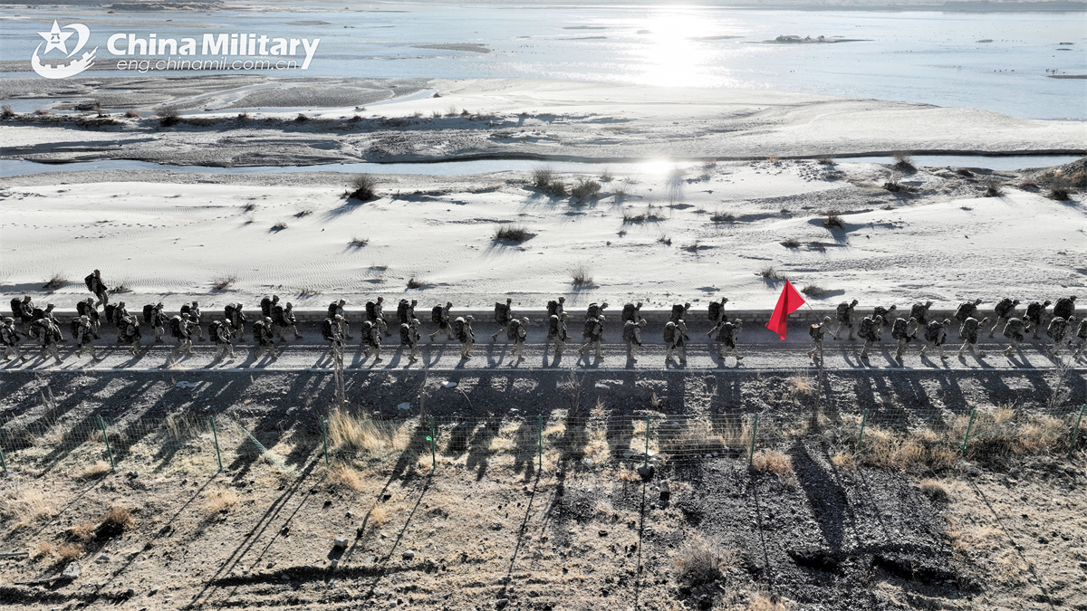 Soldiers assigned to a regiment of the Chinese PLA Xizang Military Command march forward in line during the foot march training on December 23, 2024. (eng.chinamil.com.cn/Photo by Chen Yuji)