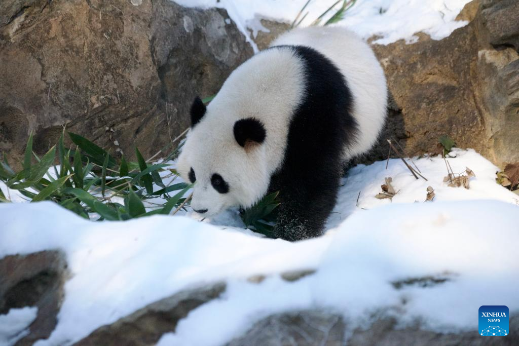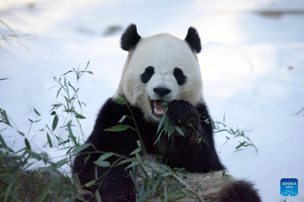 Female giant panda Qing Bao eats bamboo at the Smithsonian's National Zoo in Washington, D.C., the United States, on Jan. 9, 2025. The Smithsonian's National Zoo hosted a media preview event for Chinese media on Jan. 9, where giant pandas Bao Li and Qing Bao made their debut before the press. (Xinhua/Deng Xianlai)