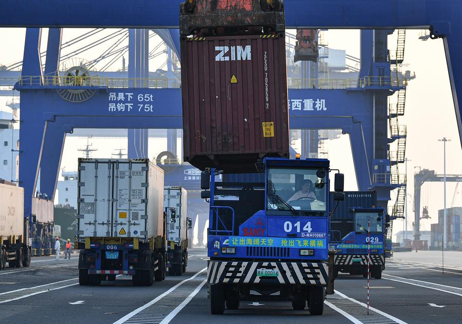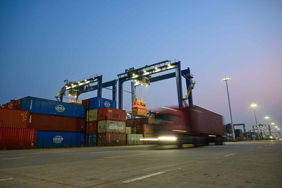 Containers are transported at Yangpu International Container Port in the Yangpu Economic Development Zone in Danzhou, south China's Hainan Province, Jan. 9, 2025. (Xinhua/Pu Xiaoxu)