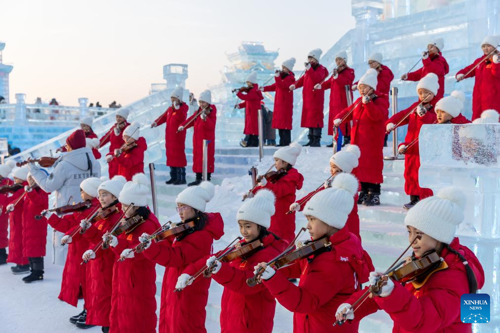 A violinist and children perform a flash mob at the Harbin Ice-Snow World in Harbin, northeast China's Heilongjiang Province, on Jan. 12, 2025. The flash mob took place here on Sunday to cheer on the upcoming 9th Asian Winter Games. (Xinhua/Zhang Tao)