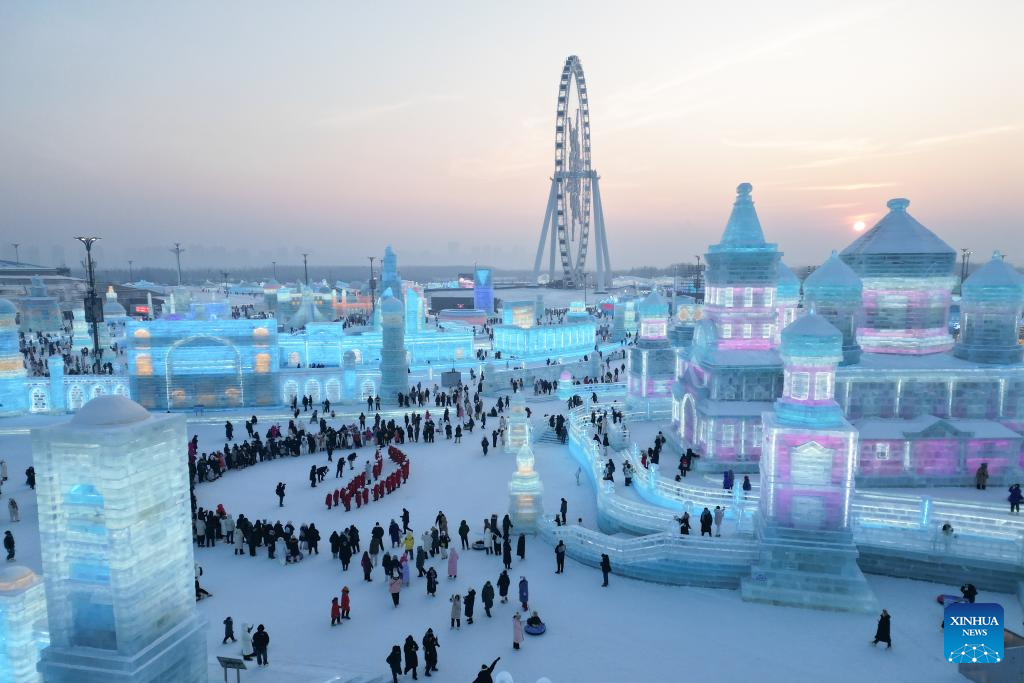 An aerial drone photo shows the view of the Harbin Ice-Snow World in Harbin, northeast China's Heilongjiang Province, on Jan. 12, 2025. A flash mob took place here on Sunday to cheer on the upcoming 9th Asian Winter Games. (Xinhua/Zhang Tao)