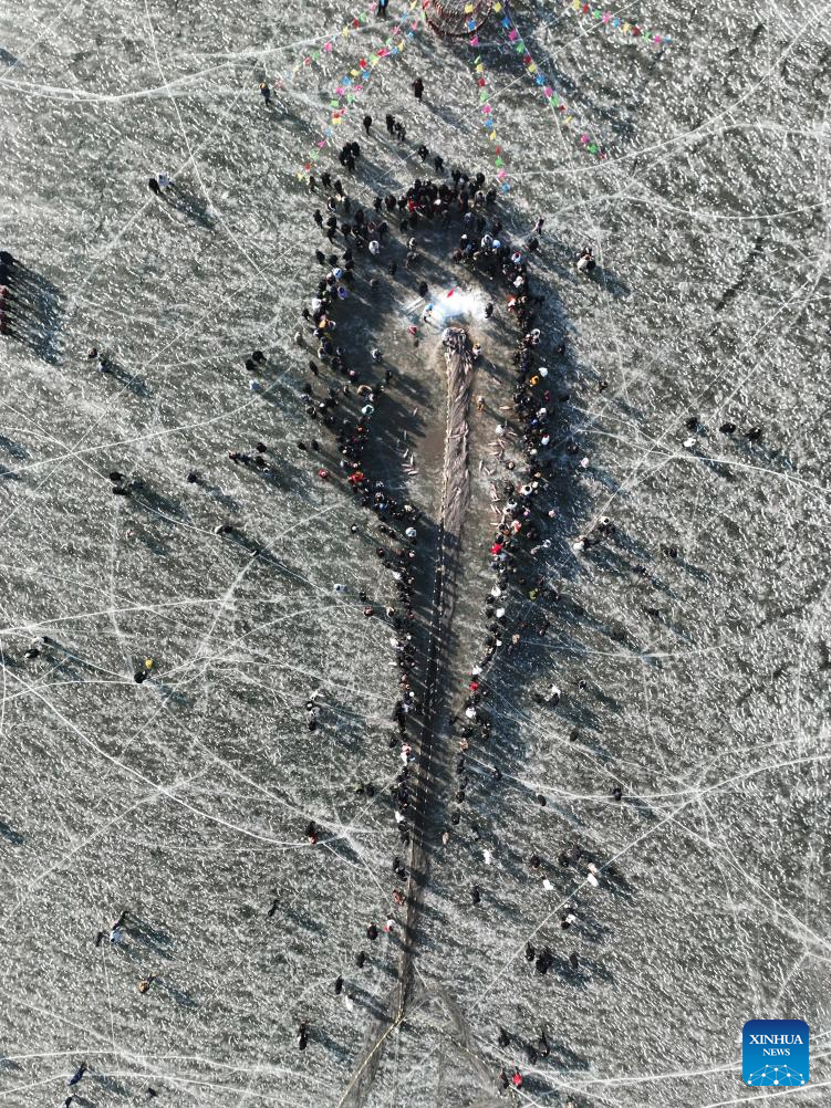 An aerial drone photo taken on Jan. 11, 2025 shows people watching a fish-catching activity at Wolong Lake in Kangping County of Shenyang, northeast China's Liaoning Province. A winter fishing-themed cultural and tourism season began here on Saturday. (Xinhua/Li Gang)
