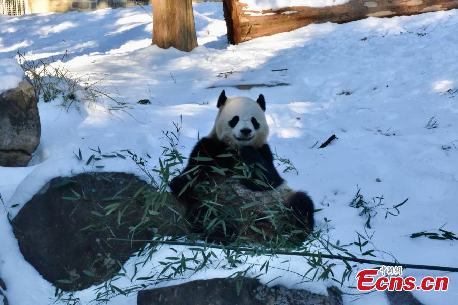 Female giant panda Qing Bao eats bamboo at the Smithsonian's National Zoo in Washington, D.C., the United States, Jan. 9, 2025. (China News Service/Shan Handing)