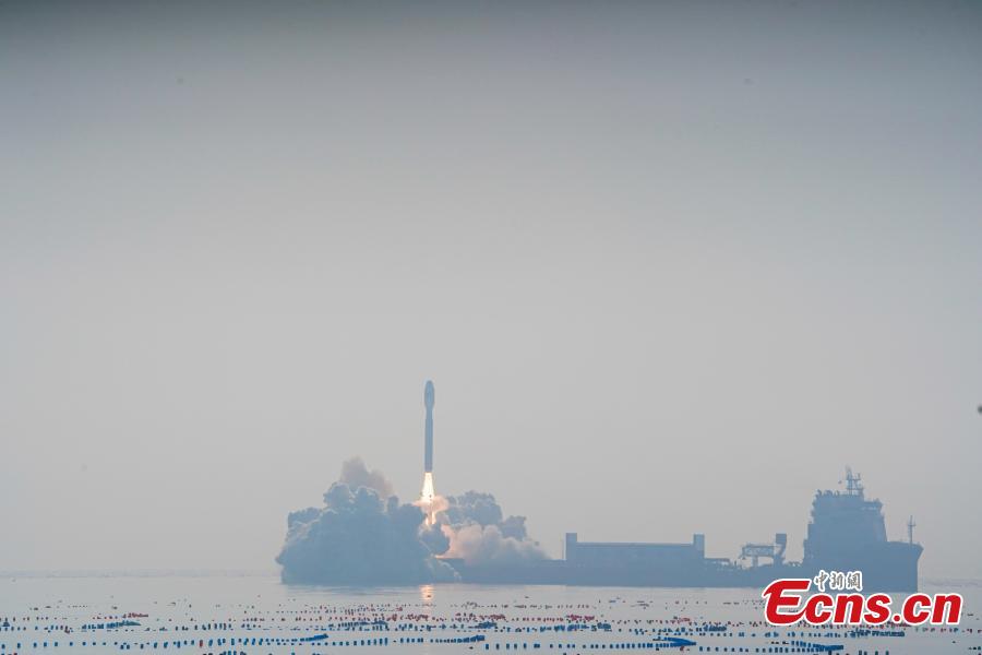 A Smart Dragon-3 rocket carrying the satellite group CentiSpace 01 blasts off from the sea near Haiyang City, east China's Shandong Province, Jan. 13, 2025. (China News Service/Xu Yajing)