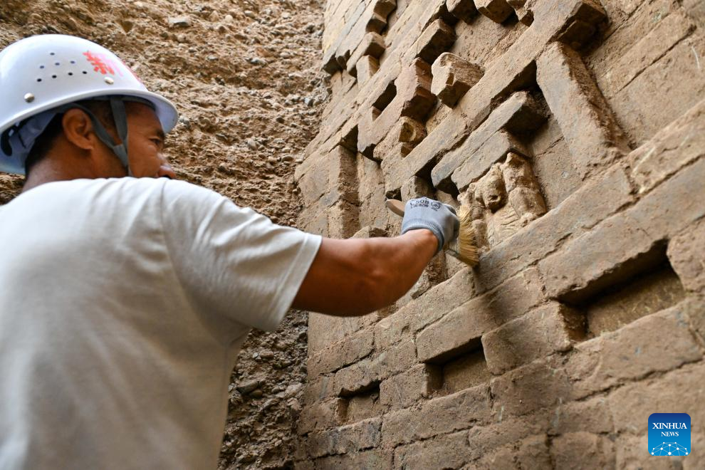 This file photo taken on Oct. 18, 2023 shows an archaeologist working at the excavation site of the Youyi Road cemetery in the city of Kuqa, northwest China's Xinjiang Uygur Autonomous Region. (Xinhua/Ding Lei)