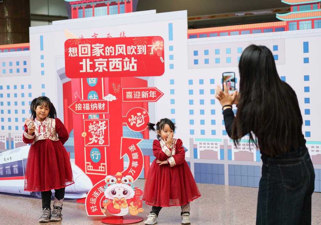 Two kids pose for a photo with a Spring Festival decoration in Beijing West Railway Station in Beijing, capital of China, Jan. 14, 2025. (Xinhua/Fan Yuqing)