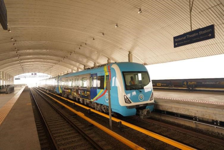 A train of the Lagos Rail Mass Transit Blue Line in Lagos, Nigeria, constructed by a Chinese company, stops at a station. (People's Daily/Jiang Xuan)