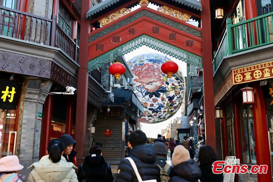 A giant lantern painted with blooming peony flowers is installed at Qianmen Street in Beijing, adding a festive atmosphere, Jan. 15, 2025. (China News Service/Yi Haifei)