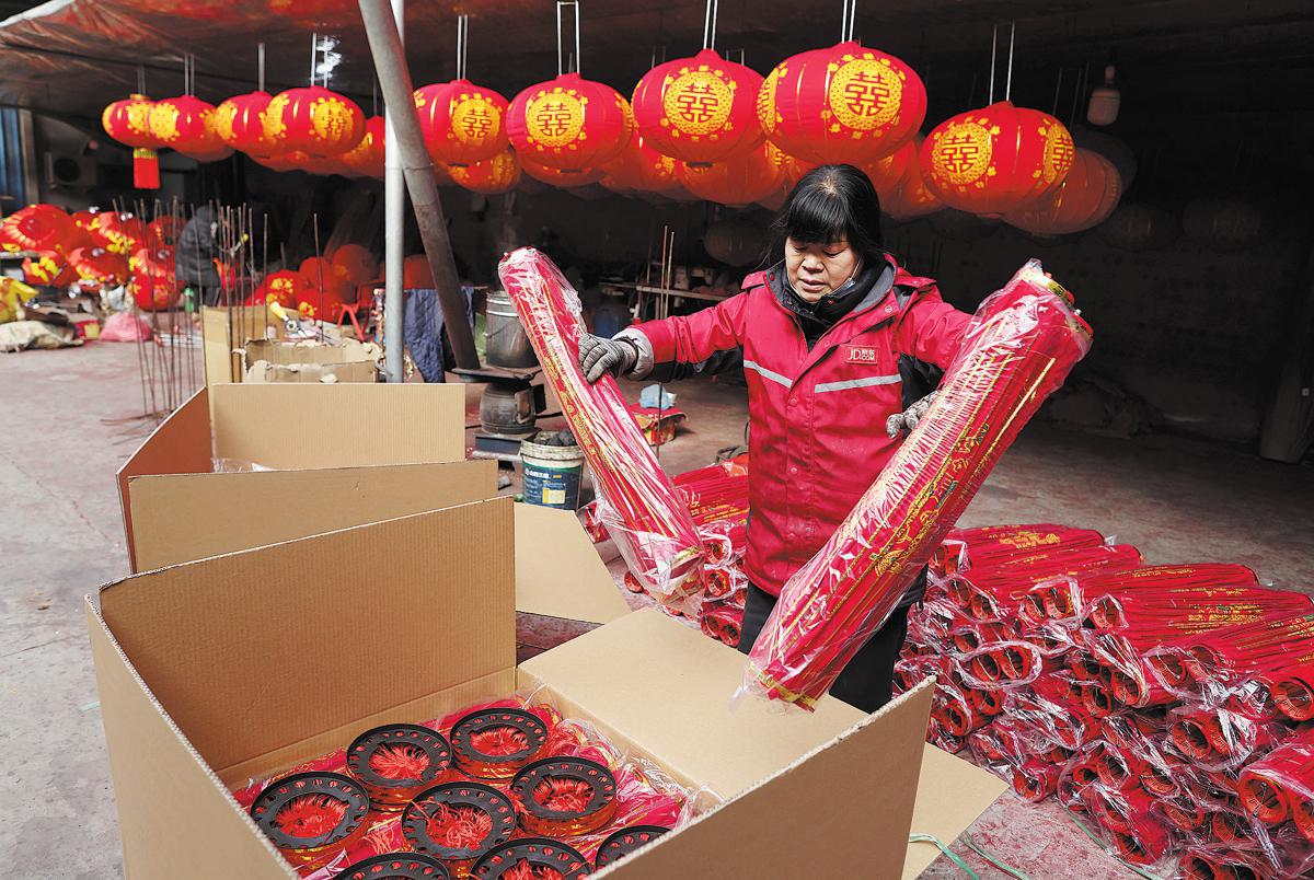 A worker packages lanterns in the village on Jan 11. (Zhu Xingxin/China Daily)