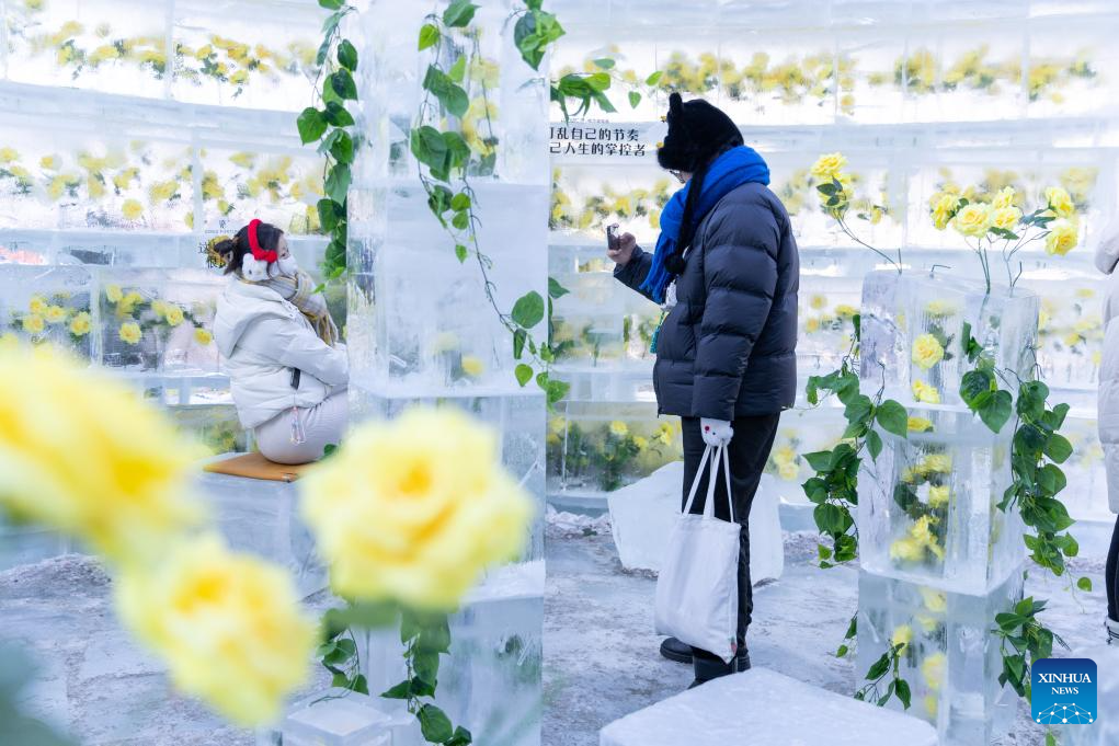 A tourist poses for photos with golden roses encased in ice sculptures in Harbin, northeast China's Heilongjiang Province, Jan. 16, 2025. This winter, Harbin is drawing tourists with its stunning winter landscape, fueling a significant boom in its ice and snow tourism industry. (Xinhua/Zhang Tao)