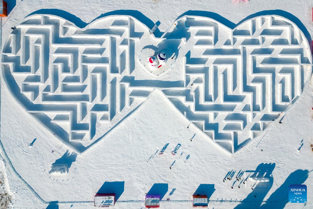 An aerial drone photo shows tourists having fun at the Happy Island, an outdoor ice and snow amusement park in Harbin, northeast China's Heilongjiang Province, Jan. 15, 2025. This winter, Harbin is drawing tourists with its stunning winter landscape, fueling a significant boom in its ice and snow tourism industry. (Xinhua/Zhang Tao)