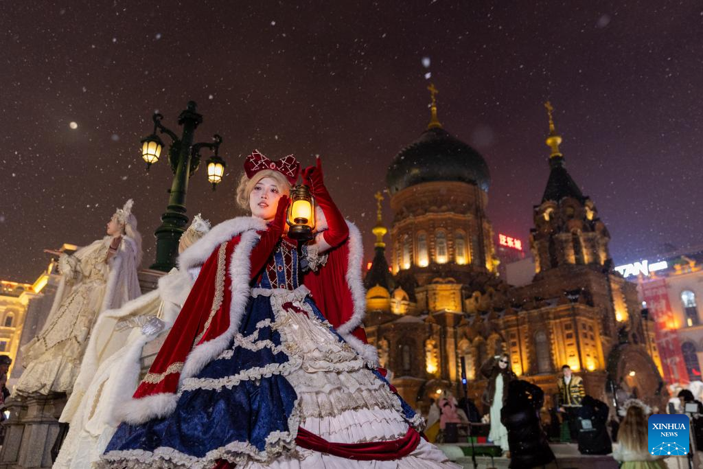 Tourists have fun at the Central Street in Harbin, northeast China's Heilongjiang Province, Jan. 13, 2025. This winter, Harbin is drawing tourists with its stunning winter landscape, fueling a significant boom in its ice and snow tourism industry. (Xinhua/Zhang Tao)
