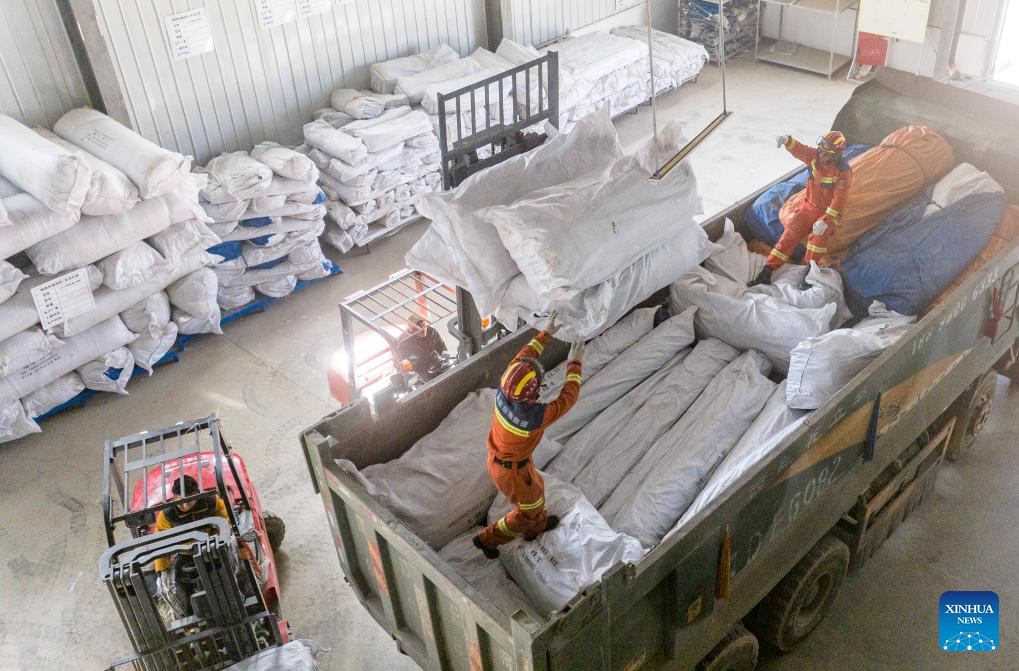 An aerial drone photo shows disaster relief support team members loading supplies onto a vehicle at a warehouse in Dingri County in Xigaze, southwest China's Xizang Autonomous Region, Jan. 15, 2025. The disaster relief work in quake-hit Dingri County including makeshift houses construction, supply transportation and debris removal work have been accelerated to better meet the needs and improve the living conditions of the residents. (Xinhua/Tenzin Nyida)