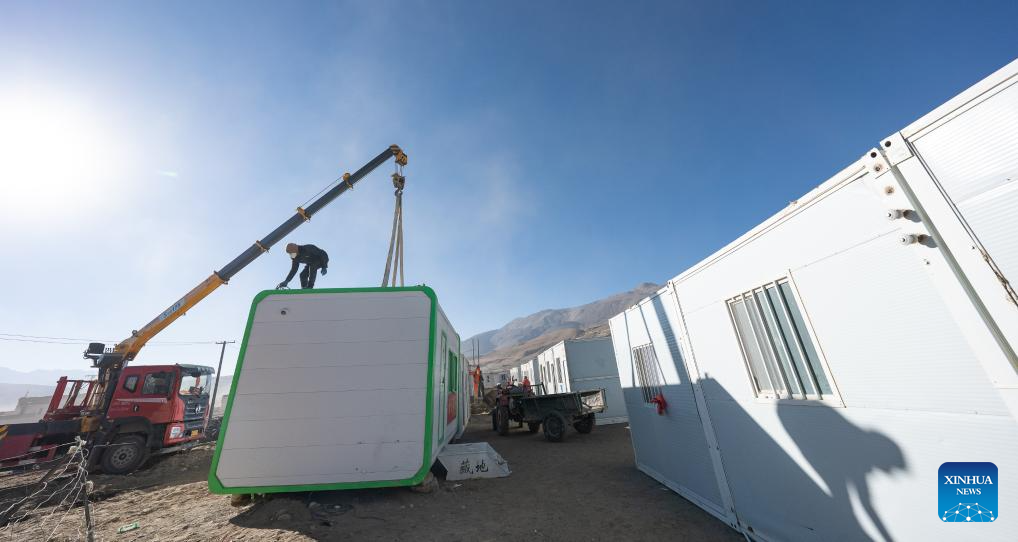 Staff members install a makeshift house in Chamco Township, Dingri County in Xigaze, southwest China's Xizang Autonomous Region, Jan. 14, 2025. The disaster relief work in quake-hit Dingri County including makeshift houses construction, supply transportation and debris removal work have been accelerated to better meet the needs and improve the living conditions of the residents. (Xinhua/Tenzin Nyida)