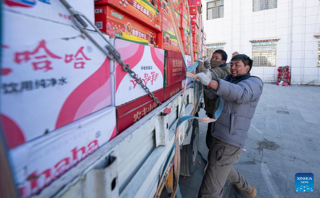 Staff members fix supplies to be delivered to quake-hit people on a vehicle at a square in Dingri County in Xigaze, southwest China's Xizang Autonomous Region, Jan. 15, 2025. The disaster relief work in quake-hit Dingri County including makeshift houses construction, supply transportation and debris removal work have been accelerated to better meet the needs and improve the living conditions of the residents. (Xinhua/Tenzin Nyida)