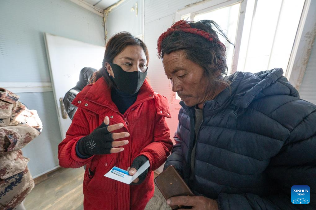 A staff member distributes a SIM card to a resident in Chamco Township, Dingri County in Xigaze, southwest China's Xizang Autonomous Region, Jan. 14, 2025. The disaster relief work in quake-hit Dingri County including makeshift houses construction, supply transportation and debris removal work have been accelerated to better meet the needs and improve the living conditions of the residents. (Xinhua/Tenzin Nyida)