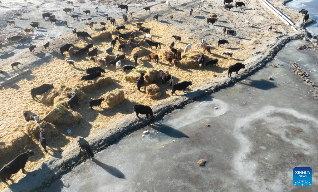 An aerial drone photo shows yaks grazing in Chamco Township, Dingri County in Xigaze, southwest China's Xizang Autonomous Region, Jan. 15, 2025. The disaster relief work in quake-hit Dingri County including makeshift houses construction, supply transportation and debris removal work have been accelerated to better meet the needs and improve the living conditions of the residents. (Xinhua/Tenzin Nyida)