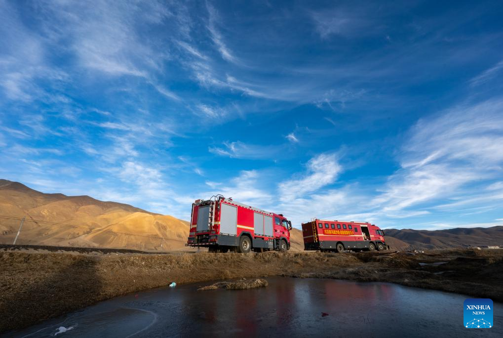 A shower truck (R) sent by Xizang fire brigade that could allow residents to take warm showers is pictured in Chamco Township, Dingri County in Xigaze, southwest China's Xizang Autonomous Region, Jan. 15, 2025. The disaster relief work in quake-hit Dingri County including makeshift houses construction, supply transportation and debris removal work have been accelerated to better meet the needs and improve the living conditions of the residents. (Xinhua/Tenzin Nyida)