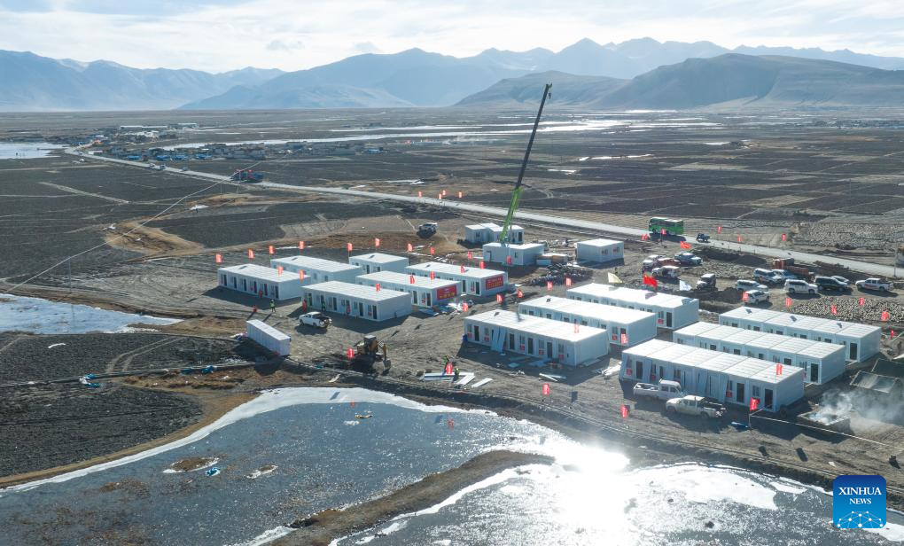 An aerial drone photo shows the construction of makeshift houses in Chamco Township, Dingri County in Xigaze, southwest China's Xizang Autonomous Region, Jan. 15, 2025. The disaster relief work in quake-hit Dingri County including makeshift houses construction, supply transportation and debris removal work have been accelerated to better meet the needs and improve the living conditions of the residents. (Xinhua/Tenzin Nyida)
