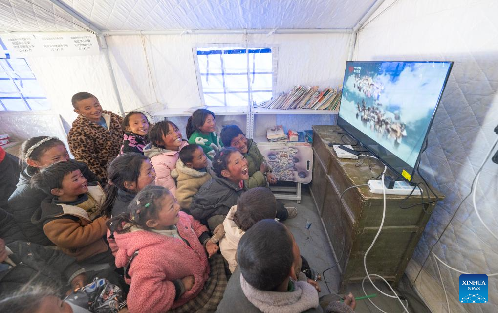 Children watch the TV series of Journey to the West in Chamco Township, Dingri County in Xigaze, southwest China's Xizang Autonomous Region, Jan. 14, 2025. The disaster relief work in quake-hit Dingri County including makeshift houses construction, supply transportation and debris removal work have been accelerated to better meet the needs and improve the living conditions of the residents. (Xinhua/Tenzin Nyida)