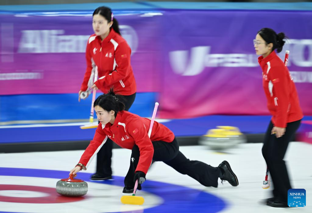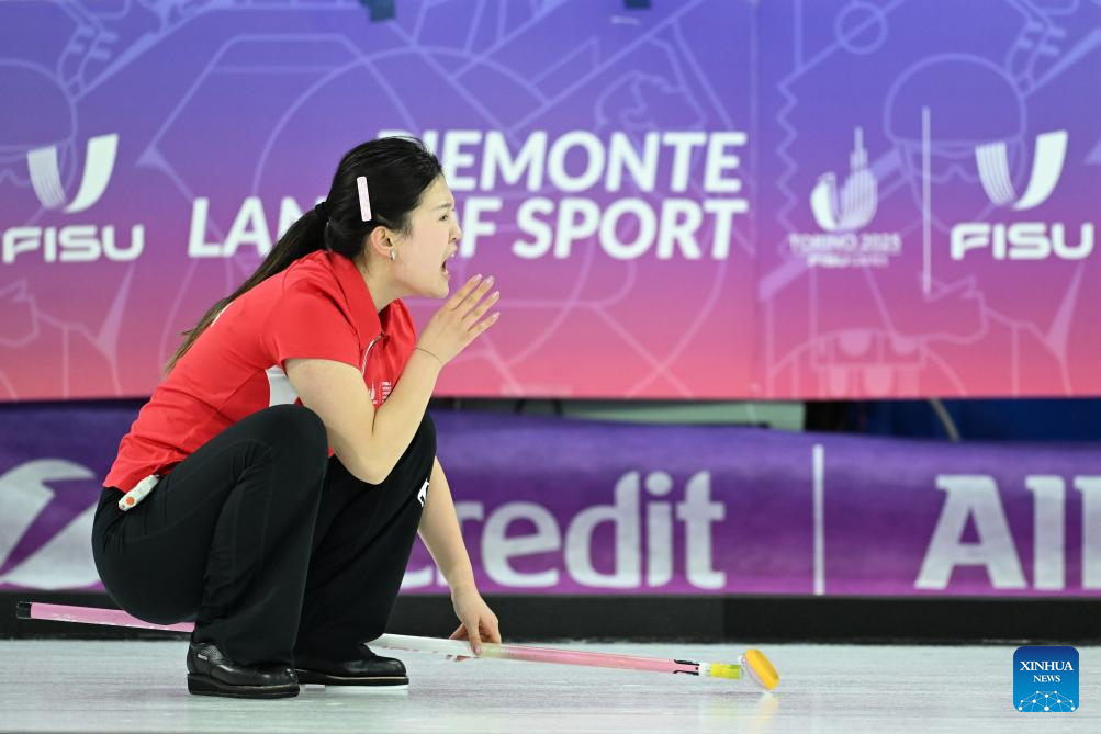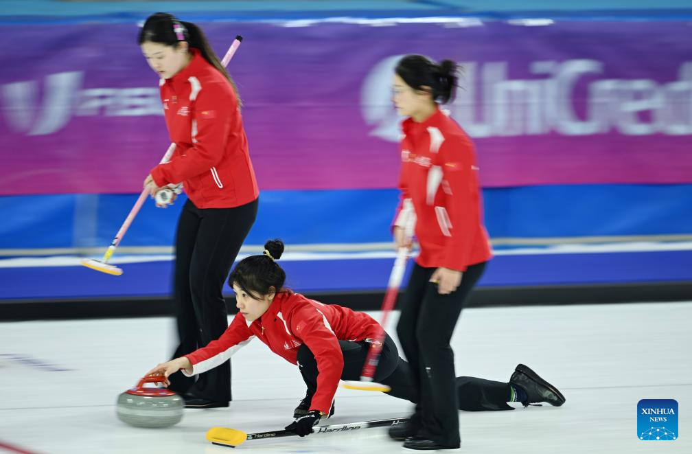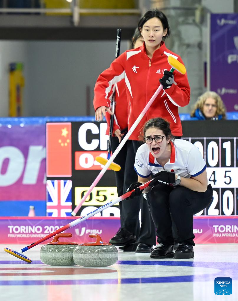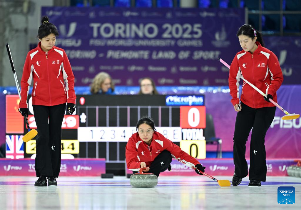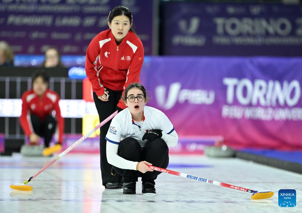 Pei Junhang (C) of China competes during the Curling Women's Round Robin Session match between China and Britain of the 2025 FISU Winter World University Games in Turin, Italy, Jan. 16, 2025. (Xinhua/He Canling)