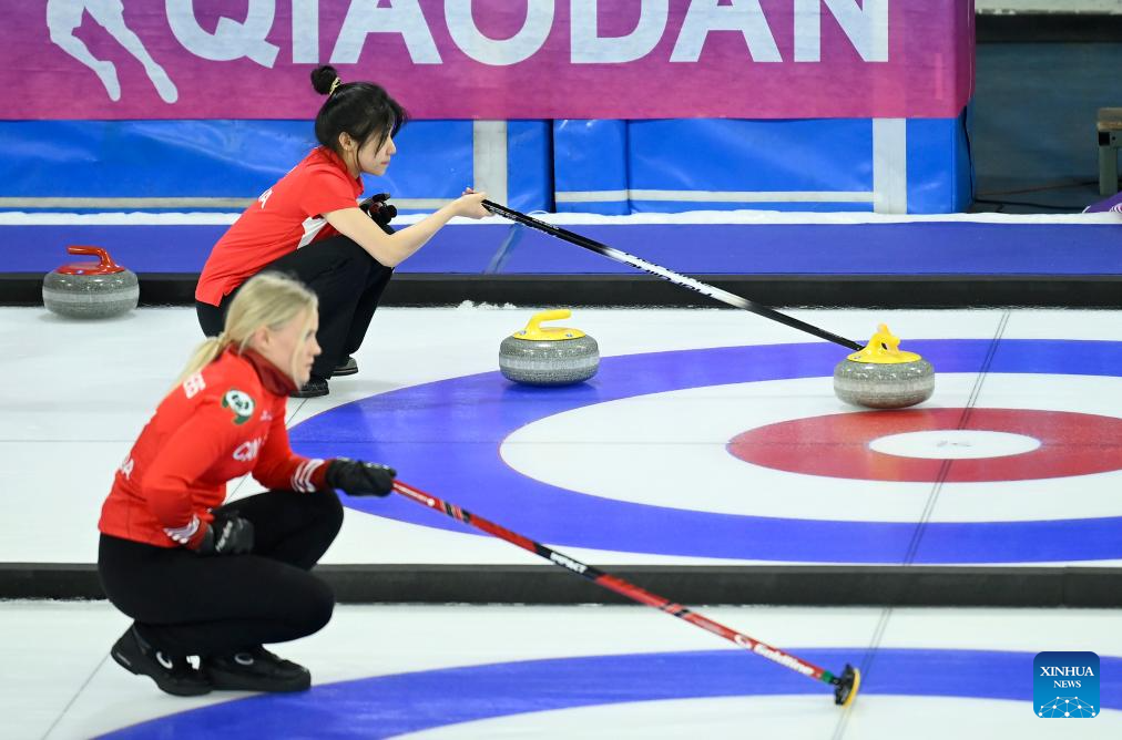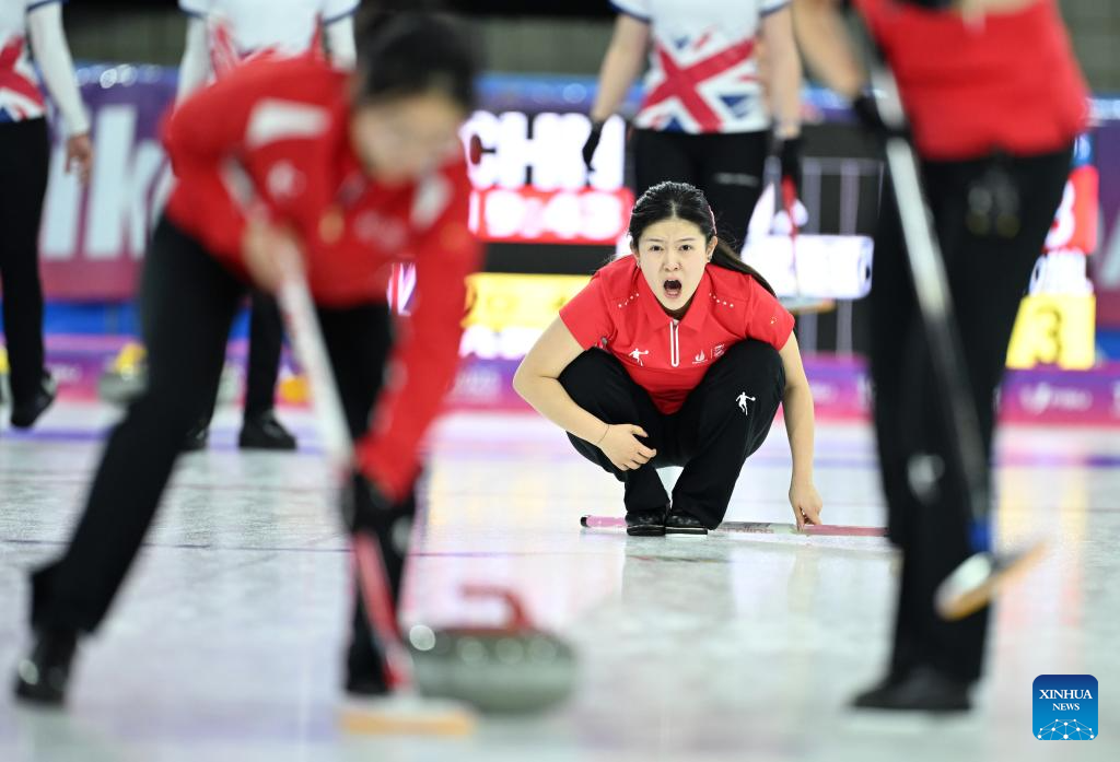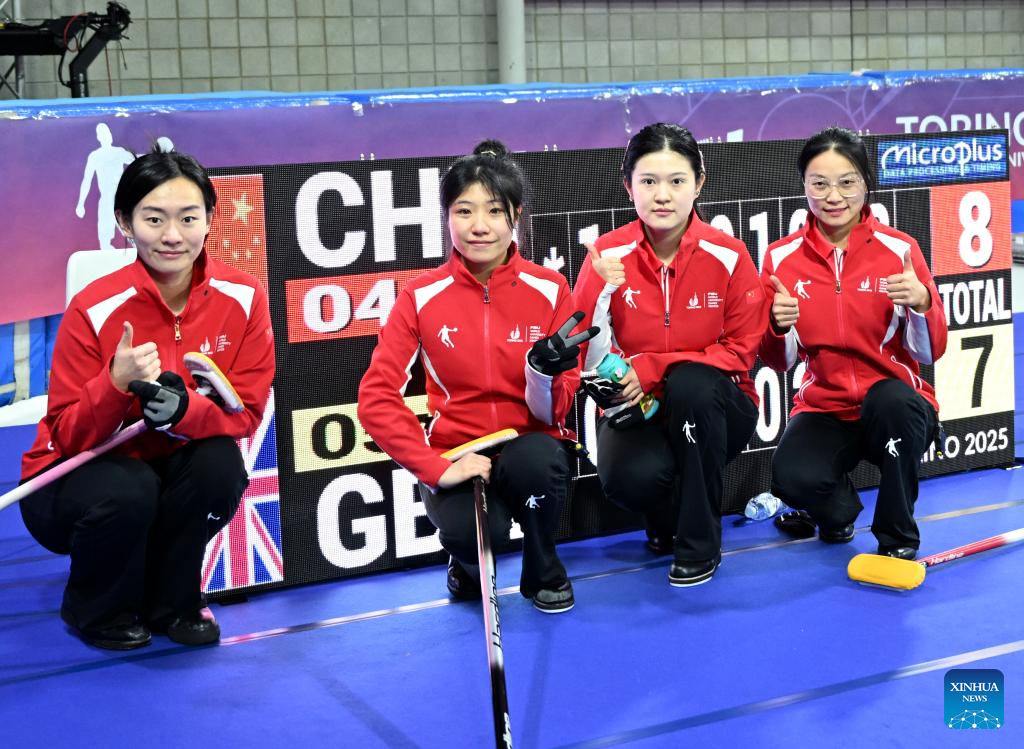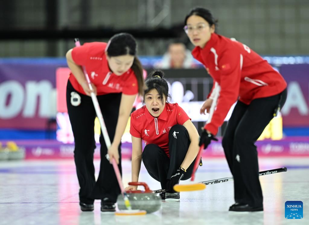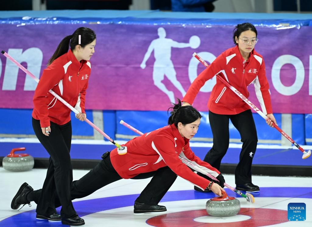 Pei Junhang (C) of China competes during the Curling Women's Round Robin Session match between China and Britain of the 2025 FISU Winter World University Games in Turin, Italy, Jan. 16, 2025. (Xinhua/He Canling)
