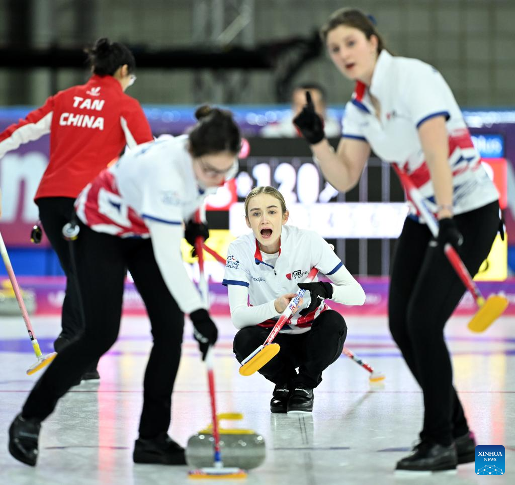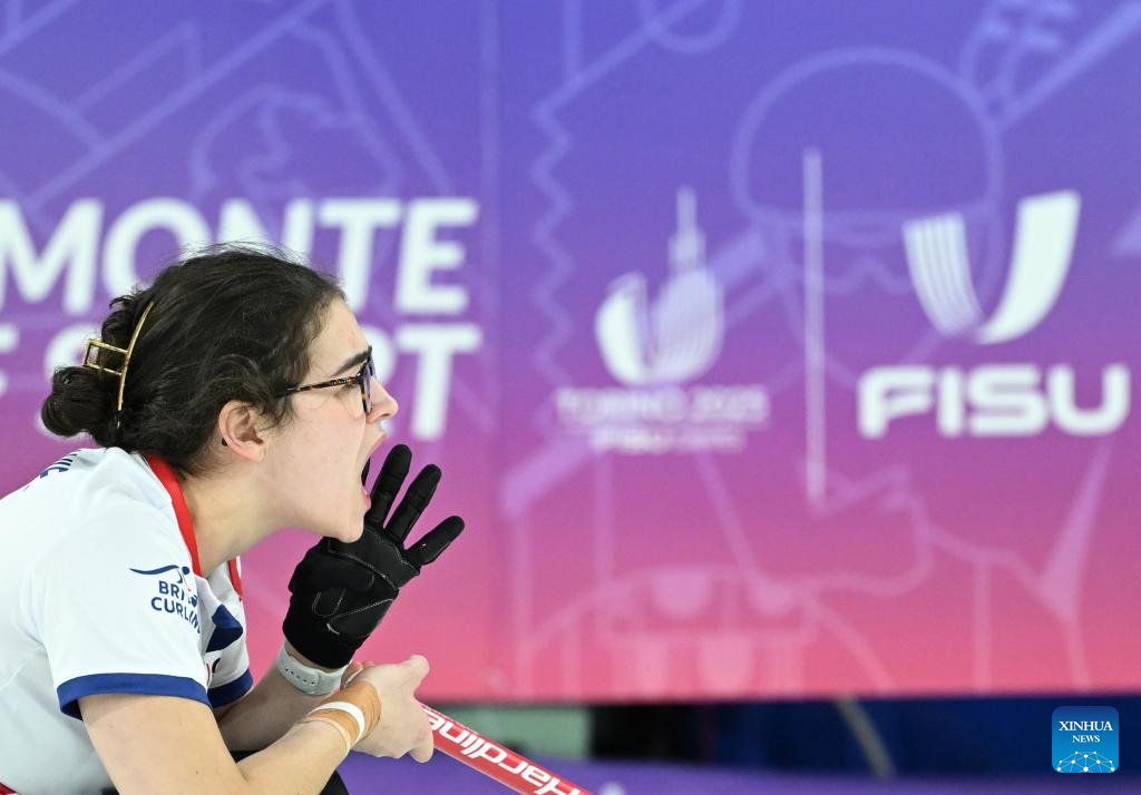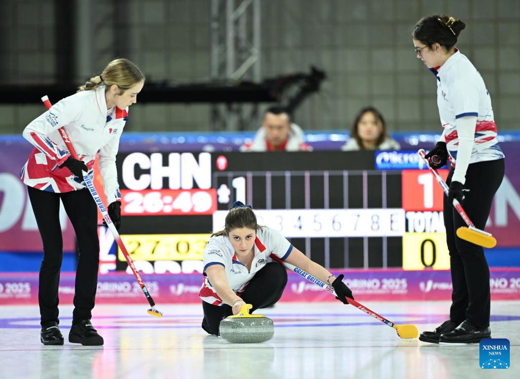 Holly Wilkie-Milne (C) of Britain competes during the Curling Women's Round Robin Session match between China and Britain of the 2025 FISU Winter World University Games in Turin, Italy, Jan. 16, 2025. (Xinhua/He Canling)