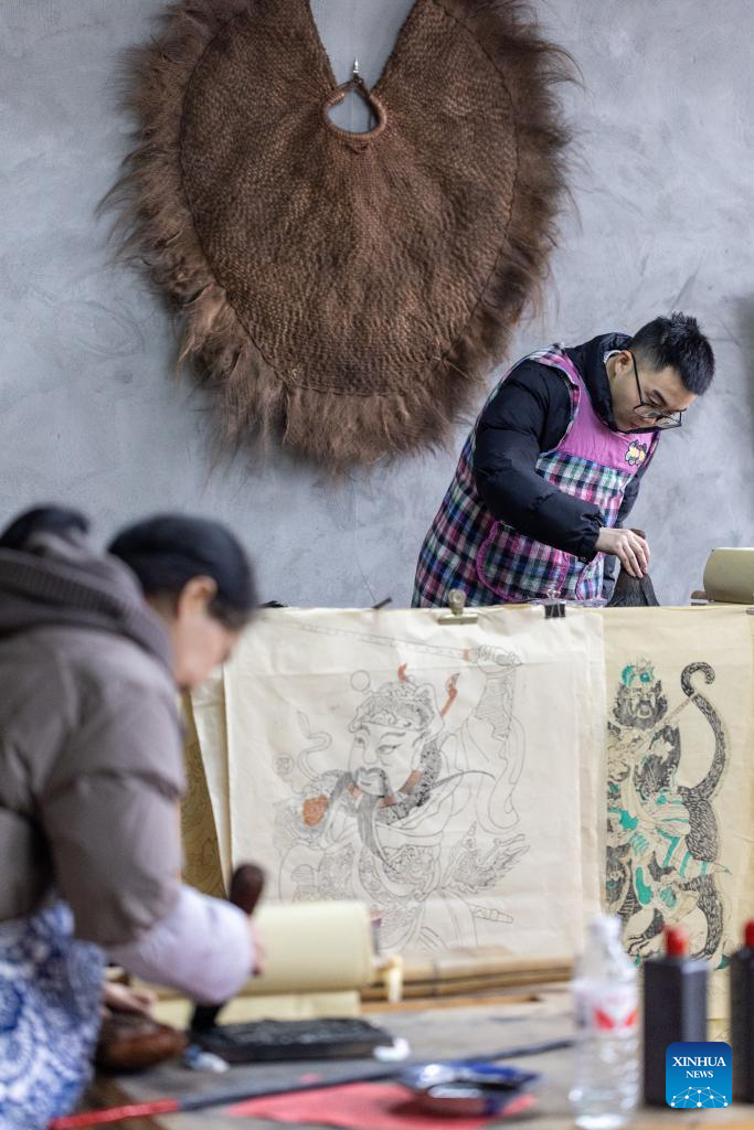 Artists make Liangping Woodblock New Year Pictures in Liangping District of southwest China's Chongqing, Jan. 14, 2025.