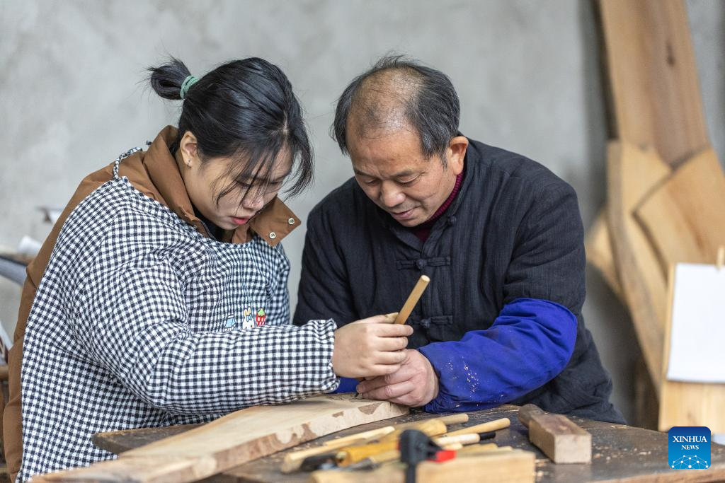Xu Jiahui (R), an intangible cultural heritage inheritor of Liangping Woodblock New Year Pictures, instructs a student with woodblock carving in Liangping District of southwest China's Chongqing, Jan. 14, 2025.