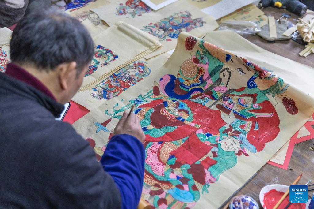 Xu Jiahui, an intangible cultural heritage inheritor of Liangping Woodblock New Year Pictures, colours a New Year Picture in Liangping District of southwest China's Chongqing, Jan. 14, 2025.