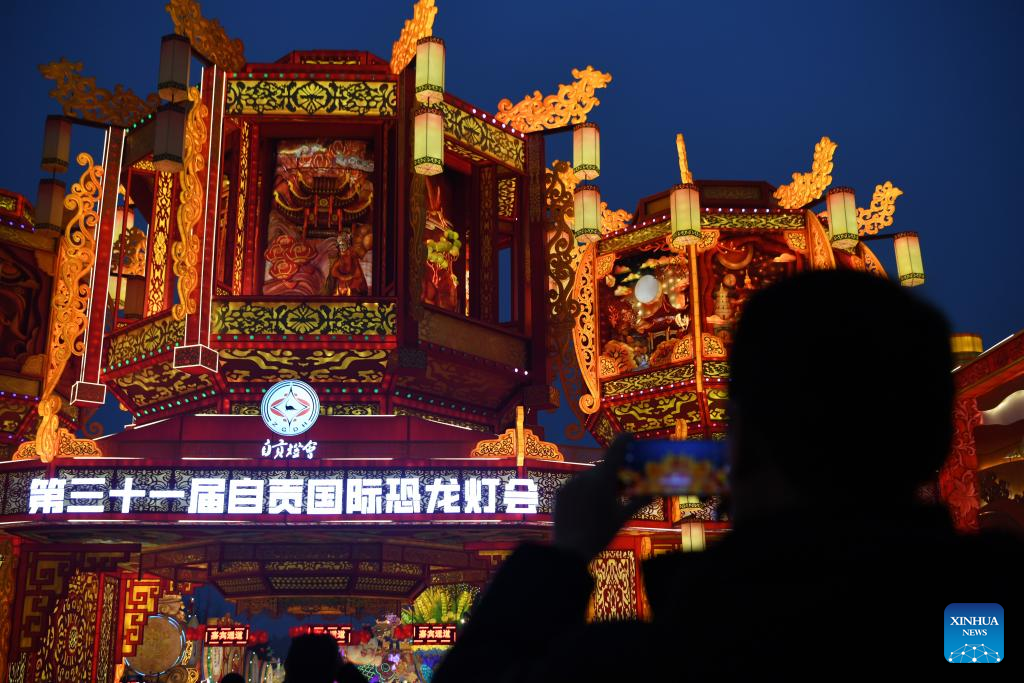 Tourists visit the 31st Zigong International Dinosaur Lantern Show in Zigong, southwest China's Sichuan Province, Jan. 17, 2025. The 31st Zigong International Dinosaur Lantern Show kicked off here on Friday. This year's lantern show features 12 groups of super-large light sets, seven groups of large light sets and more than 200 groups of small and medium-sized light sets. The scale of the lantern displays has set a new record in the history of the Zigong International Dinosaur Lantern Show. (Xinhua/Wang Xi)