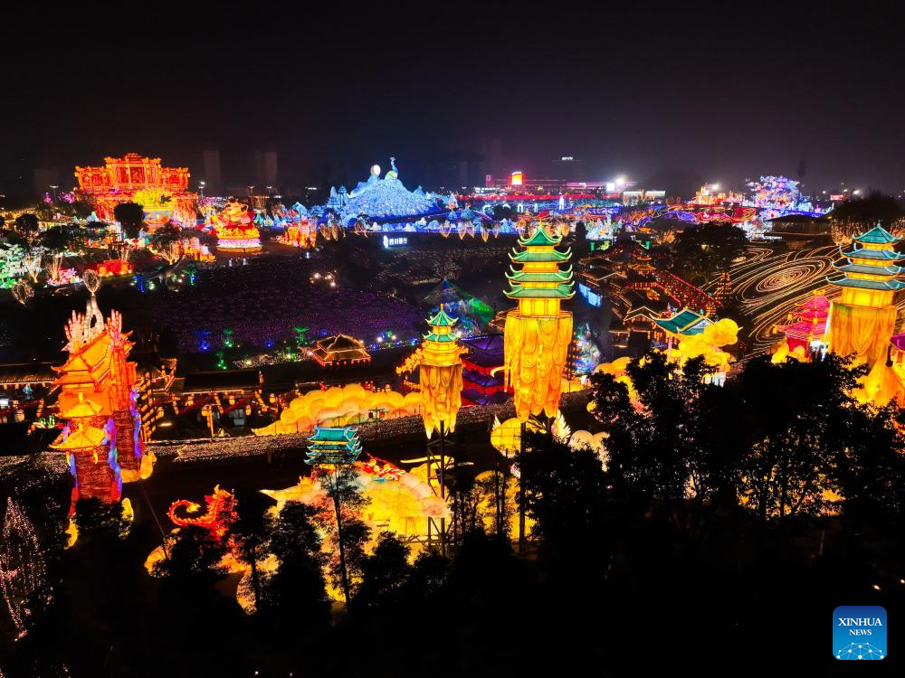 An aerial drone photo shows a view of the 31st Zigong International Dinosaur Lantern Show in Zigong, southwest China's Sichuan Province, Jan. 17, 2025. The 31st Zigong International Dinosaur Lantern Show kicked off here on Friday. This year's lantern show features 12 groups of super-large light sets, seven groups of large light sets and more than 200 groups of small and medium-sized light sets. The scale of the lantern displays has set a new record in the history of the Zigong International Dinosaur Lantern Show. (Xinhua/Wang Xi)