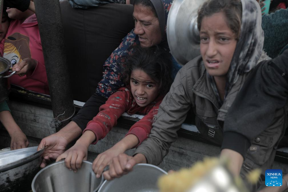 Palestinians wait to receive free food from a food distribution center in the southern Gaza Strip City of Khan Younis, Jan. 17, 2025. (Photo by Rizek Abdeljawad/Xinhua)