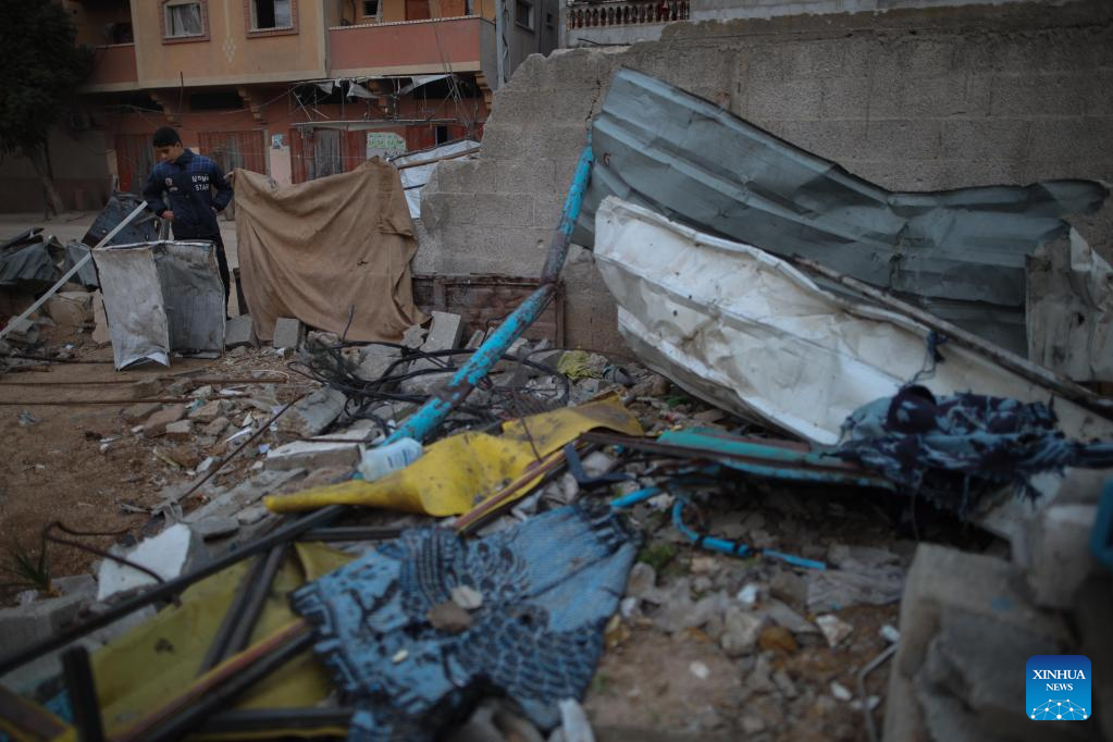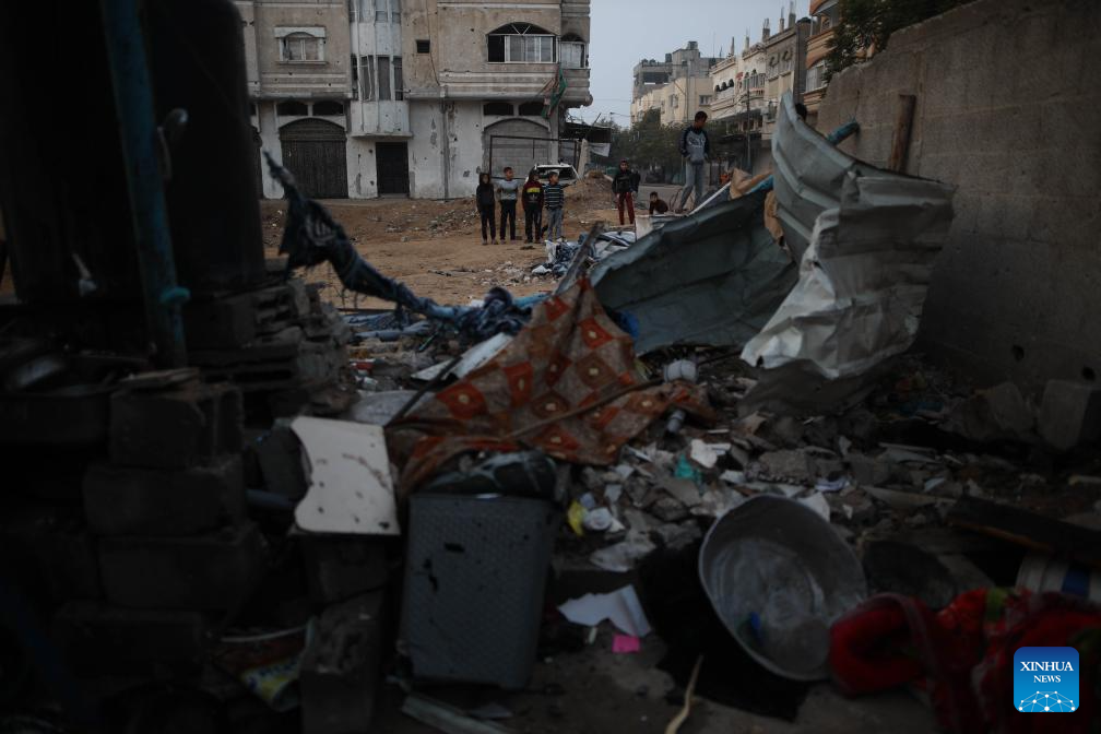 Palestinians are seen at the site of a destroyed tent after an Israeli bombardment in the al-Nuseirat refugee camp in central Gaza Strip, on Jan. 17, 2025. (Photo by Marwan Dawood/Xinhua)